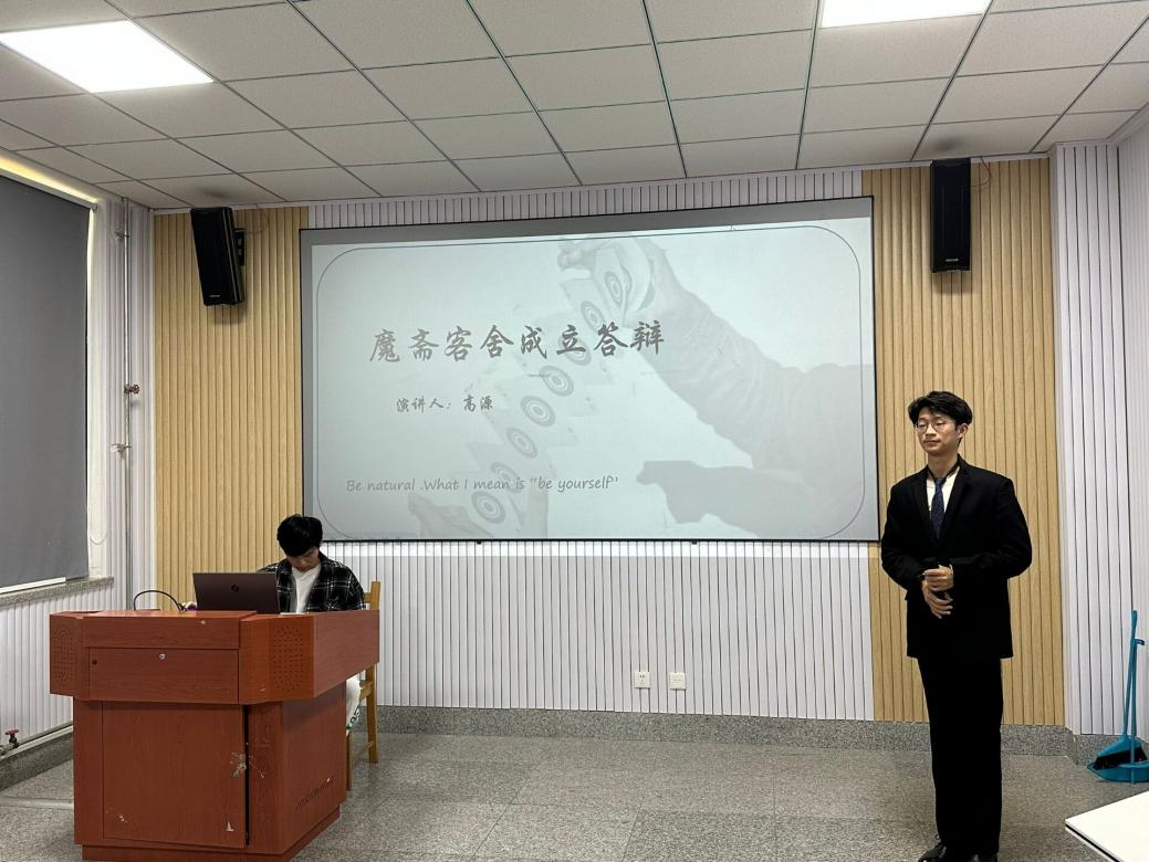 参加新社团成立答辩的新社团有(按出场顺序):言而信辩论队,魔斋客舍,微纳光学实验室。 项目化答辩社团展示主要有活动介绍,社团展示,提问环节,评分四个部分。